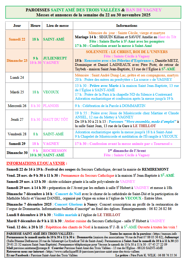 22 novembre 2025 | A la Une | Agenda | La Bresse & son canton | Le Thillot & son canton | Religion | Remiremont & son canton | Vie religieuse
