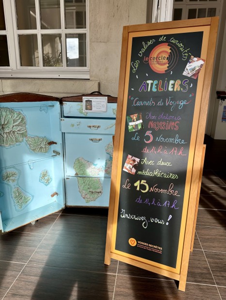 𝐋𝐞 𝐦𝐞𝐫𝐜𝐫𝐞𝐝𝐢 𝟏𝟓 𝐧𝐨𝐯𝐞𝐦𝐛𝐫𝐞 𝐝𝐞 𝟏𝟒𝐡 𝐚̀ 𝟏𝟕𝐡 en présence de l’artiste Antonia Neyrins, carnettiste et auteure de l’exposition “Les valises de curiosités africaines” visible à la médiathèque jusqu’au 20 novembre.