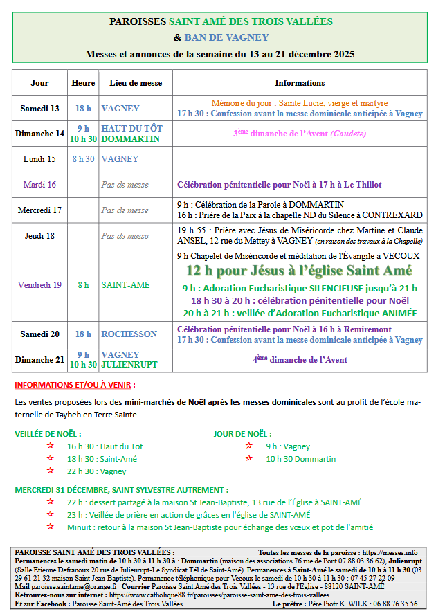 12 décembre 2025 | A la Une | Agenda | La Bresse & son canton | Le Thillot & son canton | Religion | Remiremont & son canton | Vie religieuse