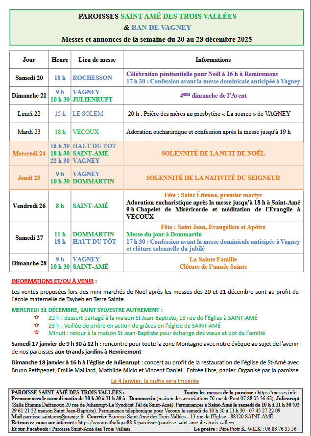 20 décembre 2025 | A la Une | Agenda | La Bresse & son canton | Le Thillot & son canton | Religion | Remiremont & son canton | Vie religieuse