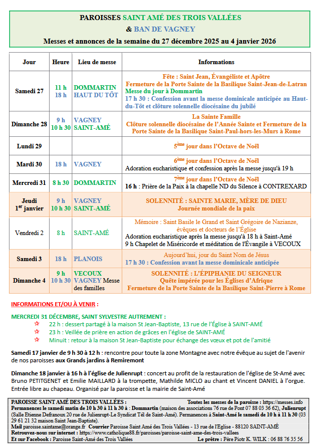Messes et annonces de la semaine du 27 décembre au 4 janvier 2026