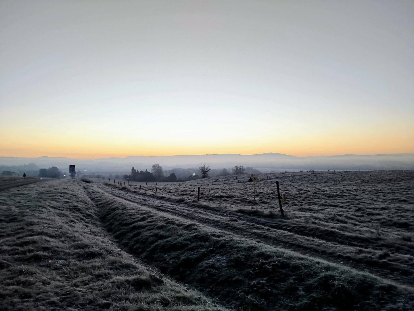 La photo prise à l’aube témoigne de cette atmosphère glacée : la nature semble suspendue, enveloppée d’un voile de givre scintillant. Les champs, les arbres et les reliefs se parent de teintes blanches et bleutées, tandis que la lumière naissante du soleil tente timidement de percer le froid intense. Le silence est presque total, seulement troublé par quelques bruits étouffés, typiques des matins d’hiver.