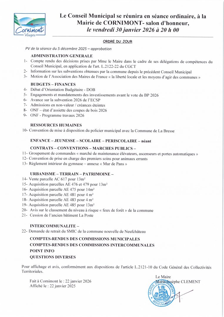 Retrouvez l’ordre du jour du conseil municipal du 30 janvier 2026 pour la ville de Cornimont :