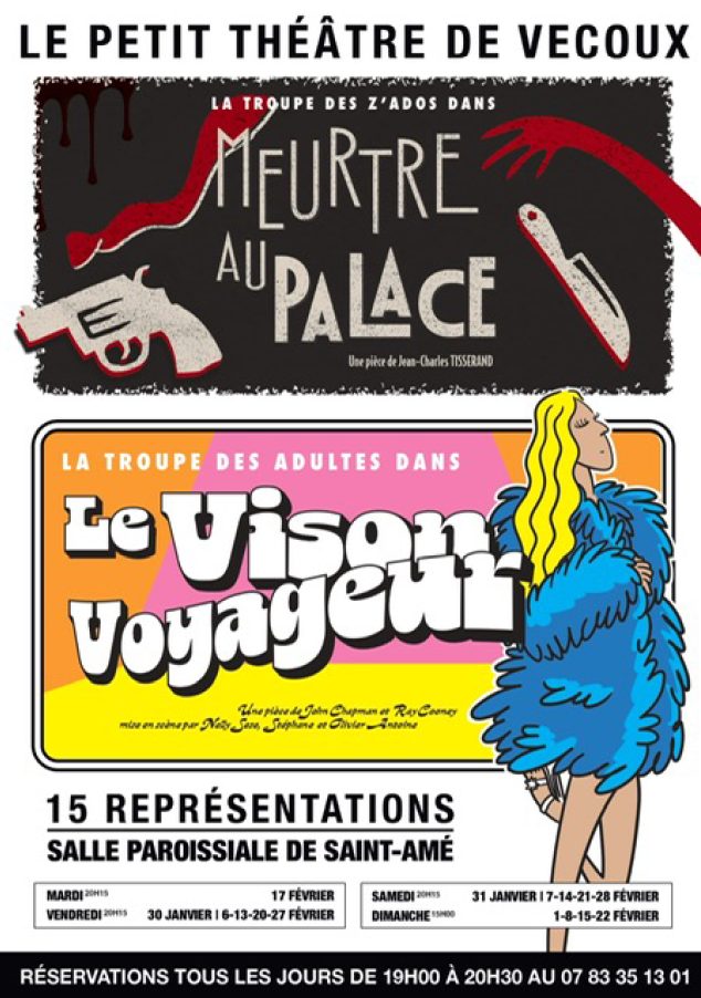 La troupe des Z’Ados dans une pièce intitulée « Meurtre au Palace » écrite et mise en scène par Jean Charles Tisserand puis celle des adultes qui interprétera cette année une comédie de boulevard de John Chapman et Ray Clooney intitulée « Le vison voyageur » mise en scène par Nelly Sesse, Stéphane et Olivier Antoine.