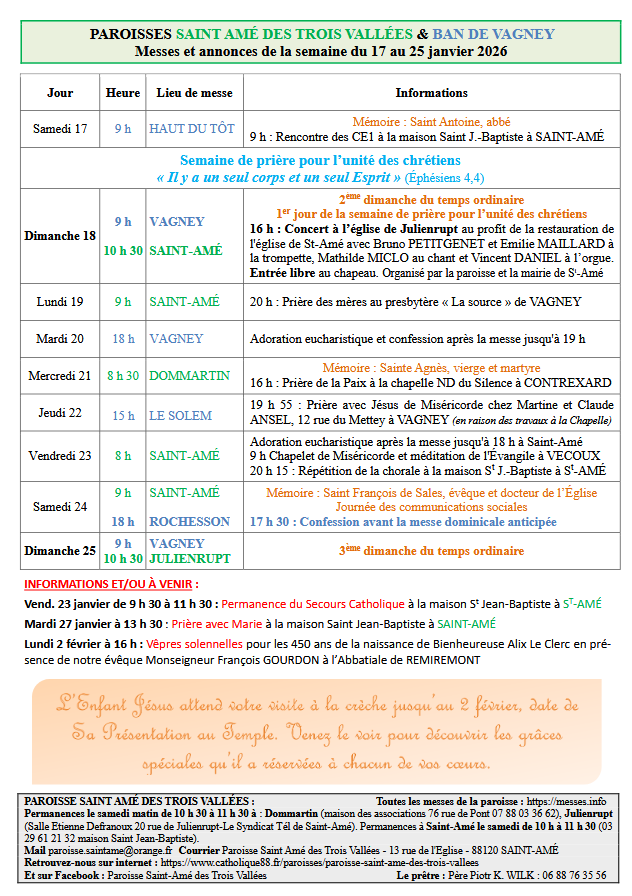 Messes et annonces de la semaine du 17 au 25 janvier