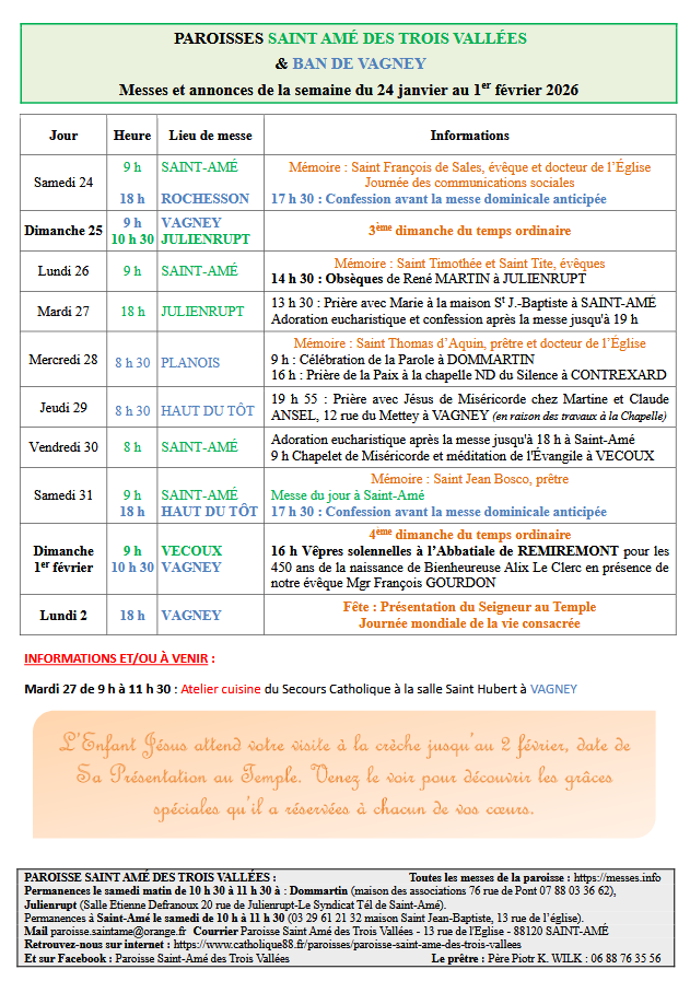 23 janvier 2026 | A la Une | Agenda | La Bresse & son canton | Religion | Remiremont & son canton | Vie religieuse