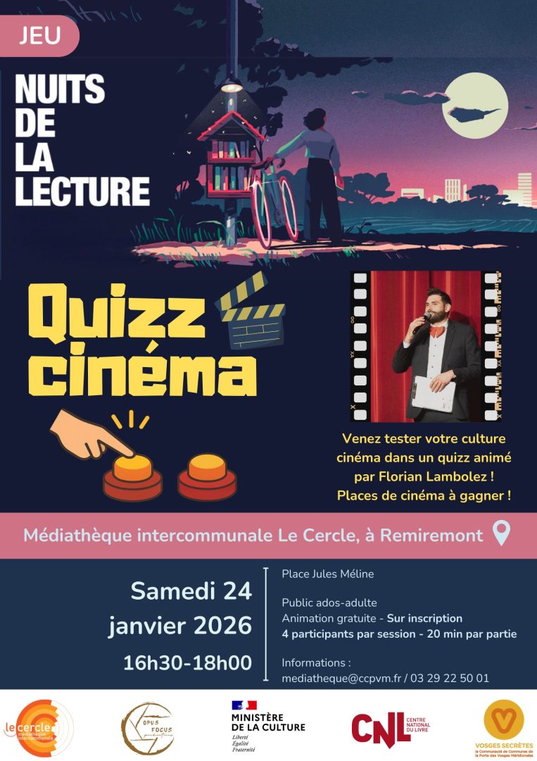 Testez votre culture cinématographique dans une ambiance de jeu télévisé, avec les mains sur le buzzer ! Animé par Florian Lambolez, ce rendez-vous ludique s’adresse à tous, experts ou non du septième art.