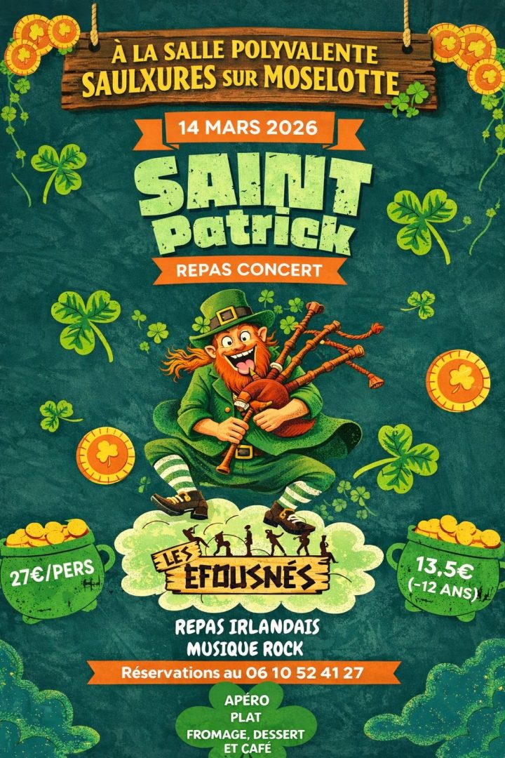 La seconde édition de la soirée Saint Patrick organisée par l’association Les Efousnés se tiendra le 14 mars 2026 à la salle polyvalente de Saulxures-sur-Moselotte.