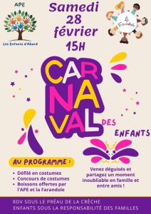 LâAPE Les Enfants dâAbord , en collaboration avec La Farandole , a le plaisir de vous inviter Ă partager un moment festif et convivial Ă lâoccasion du Carnaval đ„ł