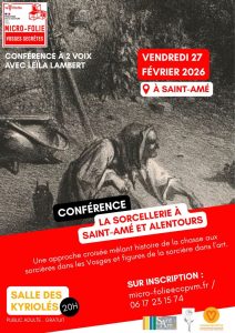 Vendredi 27 février à 20h : Une conférence à deux voix intitulée « La sorcellerie à Saint-Amé et alentours » proposera une approche croisée mêlant histoire de la chasse aux sorcières dans les Vosges et figures de la sorcière dans l’art. Conférencières : Leïla Lambert et Ophélie Chalabi. Lieu : Salle des Kyriolés. Gratuit, public adulte. Sur réservation (voir affiche).