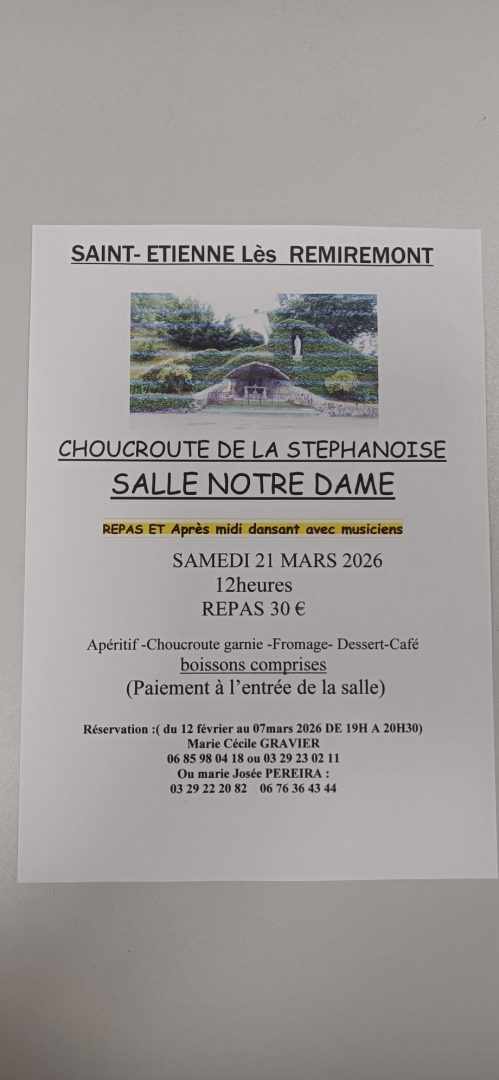 Dernières mises au point pour les membres de l Association La Stephanoise, qui préparent leur choucroute annuelle. Elle aura lieu le samedi 21 mars à partir de midi dans la salle Notre-Dame, et se poursuivra par un après-midi dansant, animé par Martial Villemin.