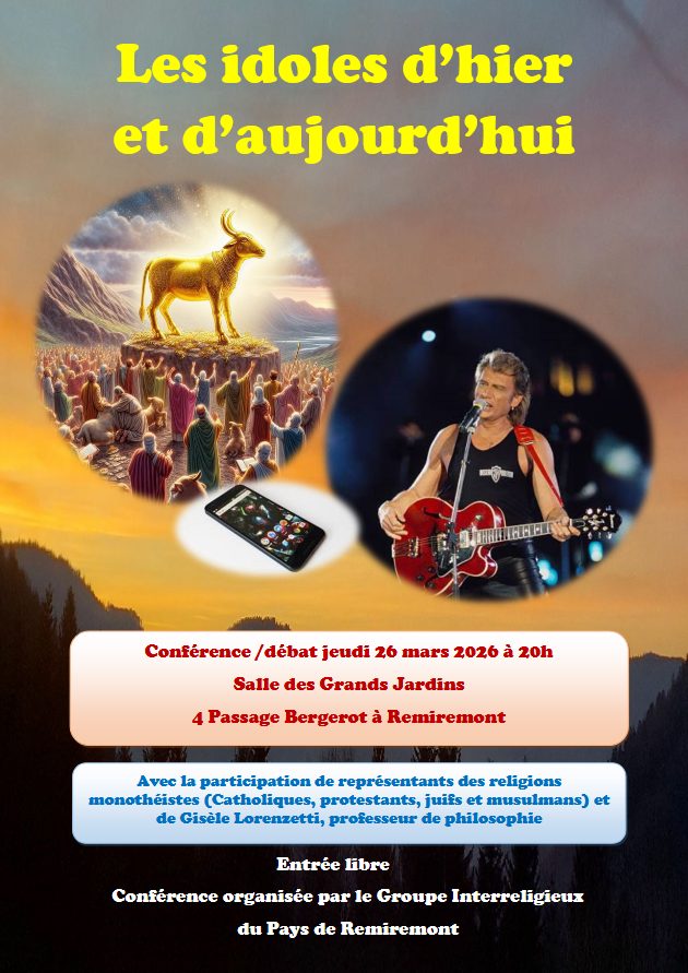 Le Groupe de dialogue Interreligieux du Pays de Remiremont vous convie à la conférence qui sera donnée le jeudi 26 Mars prochain à 20h dans la salle des Grands Jardins, 4 Passage Bergerot à Remiremont, sur le thème « Les idoles d’hier et d’aujourd’hui ». Après l’intervention des représentants des quatre religions monothéistes (Catholique, Juive, Musulmane et Protestante) Mme Gisèle Lorenzetti, professeur de philosophie développera l’historique de l’idolâtrie depuis le veau d’or au temps de Moïse jusqu’à nos jours. Entrée libre.