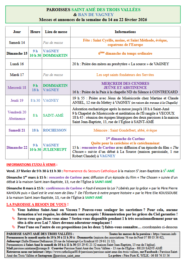 13 février 2026 | A la Une | Agenda | La Bresse & son canton | Religion | Remiremont & son canton | Vie religieuse