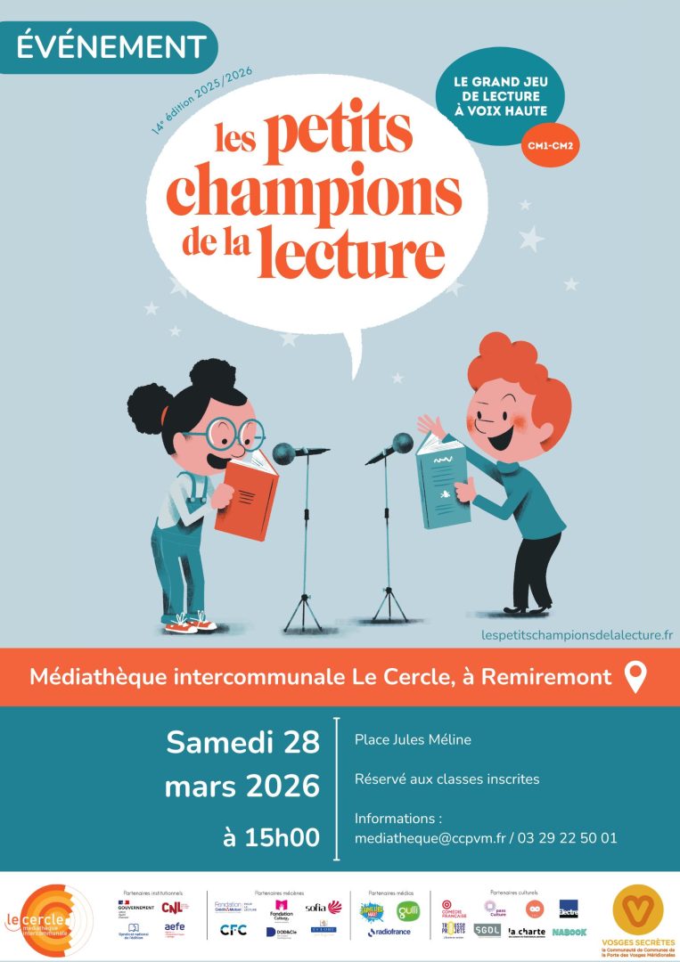 La finale départementale des petits champions de la lecture aura lieu le samedi 28 mars 2026 à 15h00 à la Médiathèque intercommunale Le Cercle, Place Jules Méline, à Remiremont.