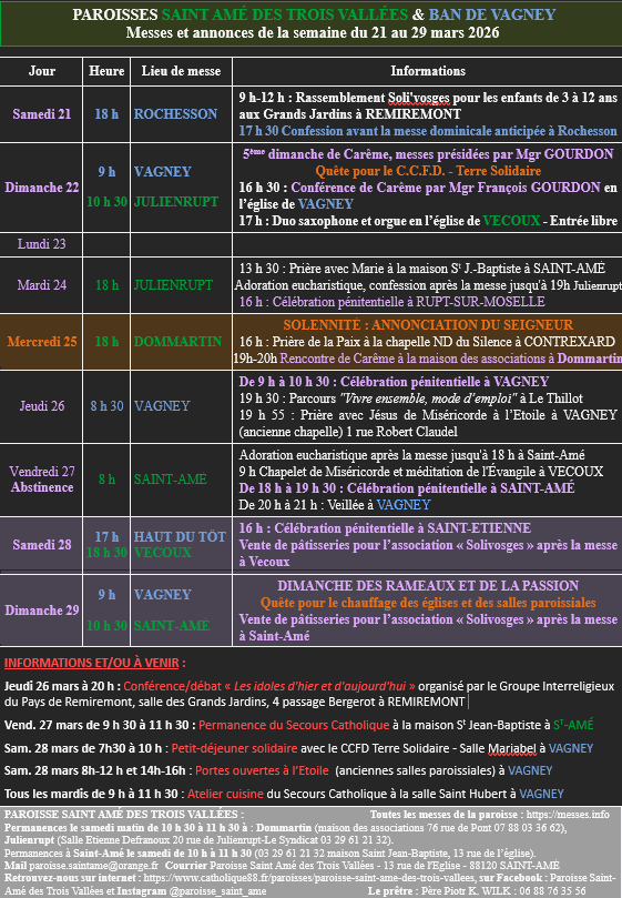 Messes et annonces de la semaine du 21 au 29 mars