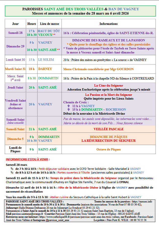 29 mars 2026 | A la Une | Agenda | La Bresse & son canton | Religion | Remiremont | Remiremont & son canton | Vie religieuse