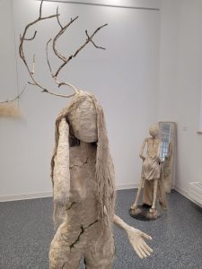 À travers six sculptures grandeur nature, l’artiste explore le rapport au corps féminin : son appropriation, son évolution et le regard que la société porte sur lui. Les figures, aux visages volontairement esquissés, prennent place dans des scènes inspirées de l’enfance et de l’adolescence, périodes où se construisent les premières injonctions autour du corps.Réalisées à partir de matériaux bruts et naturels (argile, filasse, coton, laine, branchages), les sculptures semblent vivantes, fragiles et en transformation. La scénographie, composée de voilages ajourés, invite le public à circuler dans l’espace et à questionner sa propre position de regardeur : voir, être vu, se dévoiler ou se protéger.