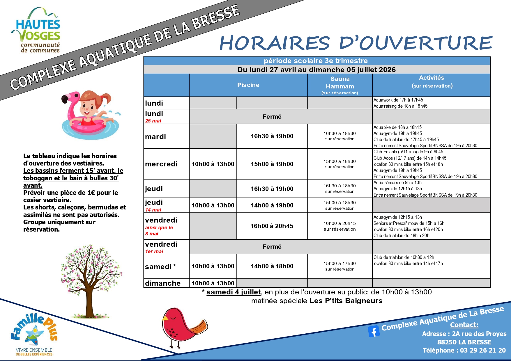 Horaires Complexe Aquatique de La Bresse – Fin du 3e trimestre