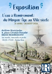 L’exposition « L’eau à Remiremont : du Moyen-Âge au XXIème siècle » sera présentée au public du 21 avril au 30 août 2026 et sera ouverte tous les mardis, mercredis et jeudis de 13h30 à 17h30. Cette présentation permettra aux visiteurs d’en apprendre davantage sur l’histoire de l’eau dans la commune et sur les coutumes qui y étaient pratiquées autrefois.