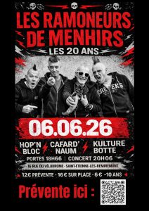 Les Ramoneurs de Menhirs fêteront leurs 20 ans de scène dans les Vosges le samedi 6 juin 2026. Leur musique mêle punk et répertoire traditionnel breton. La formation actuelle repose sur une guitare, une boîte à rythmes, un chant lead et deux sonneurs. Le projet réunit plusieurs générations de public et s’adresse à un public familial.