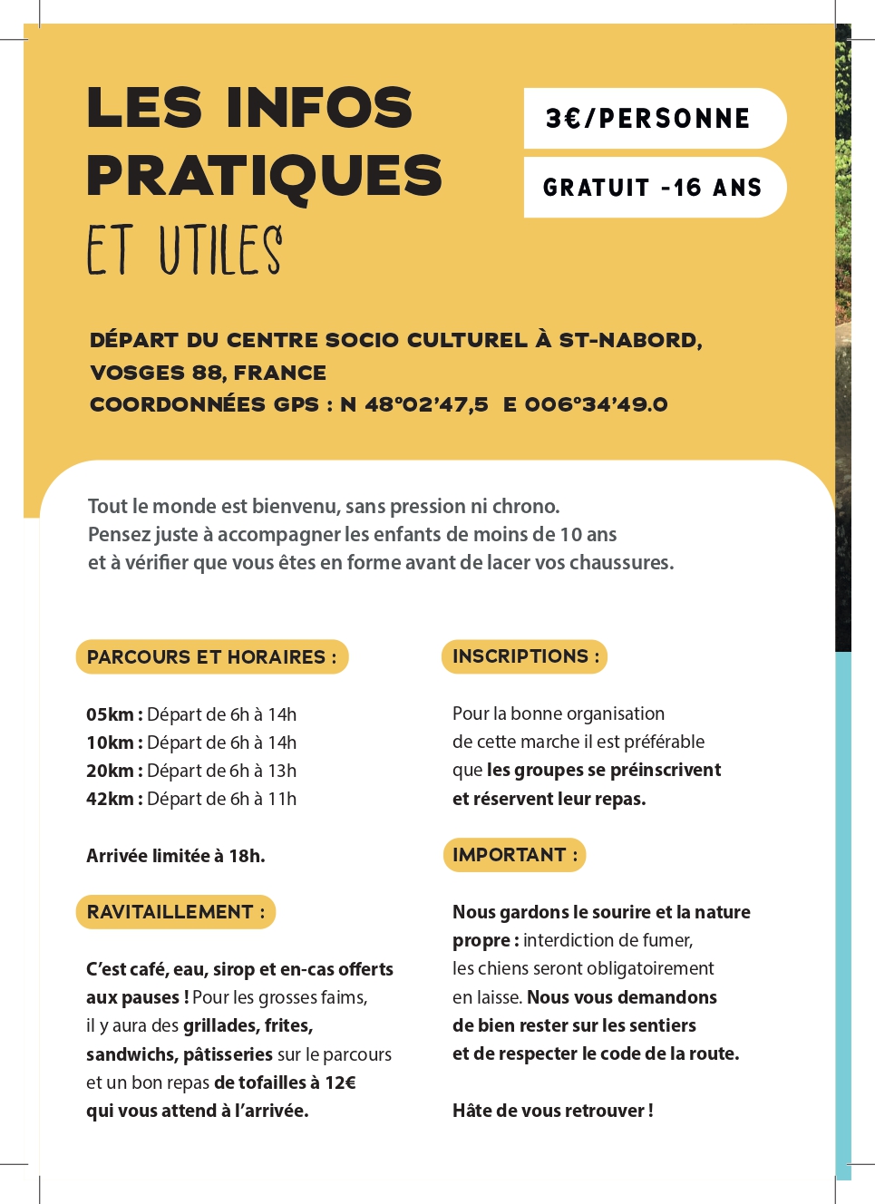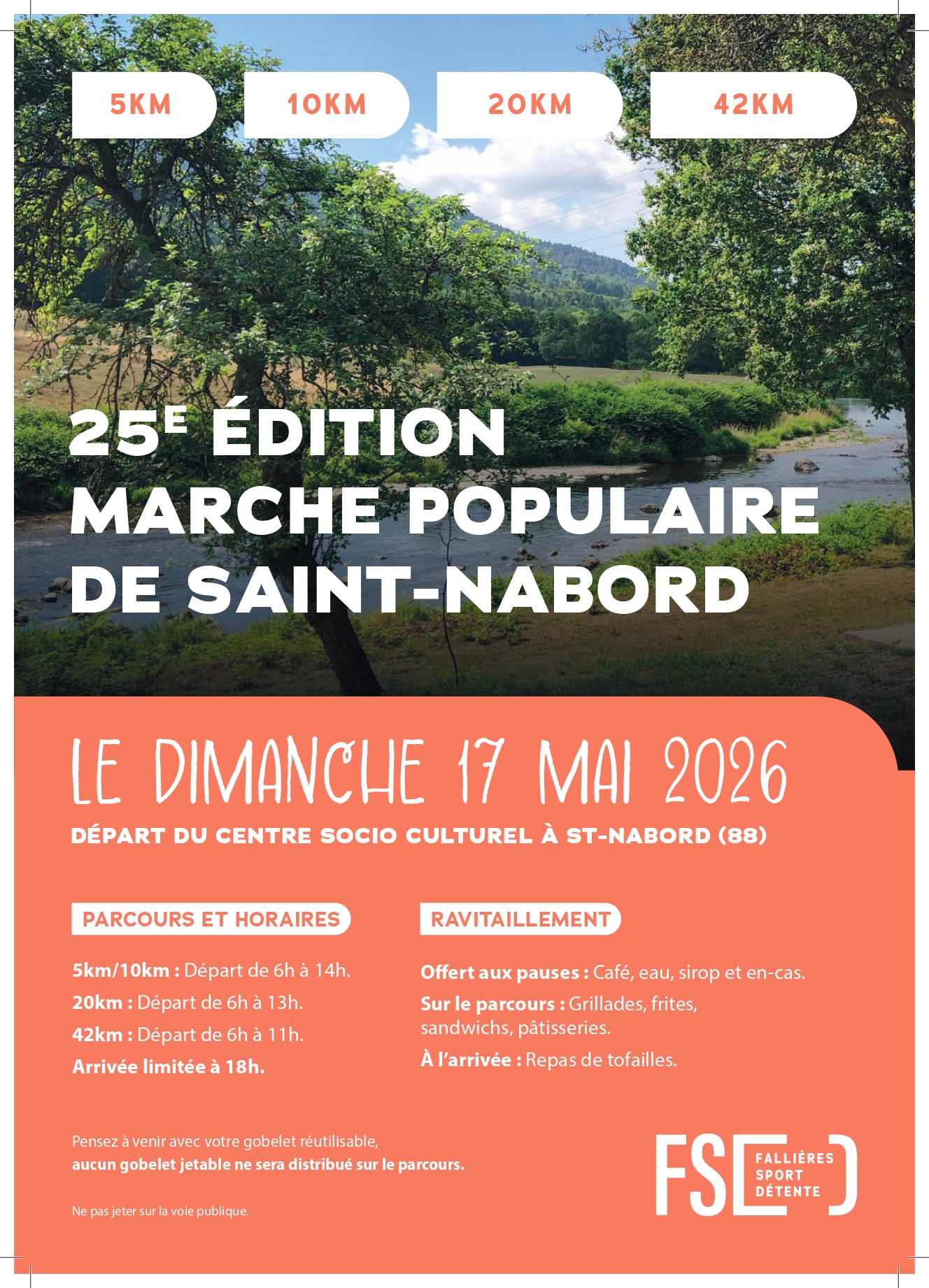 La 25ème Marche Populaire de Saint Nabord aura lieu le dimanche 17 mai 2026 avec 4 parcours au programme soit : : 5, 10, 20 ou 42 km.