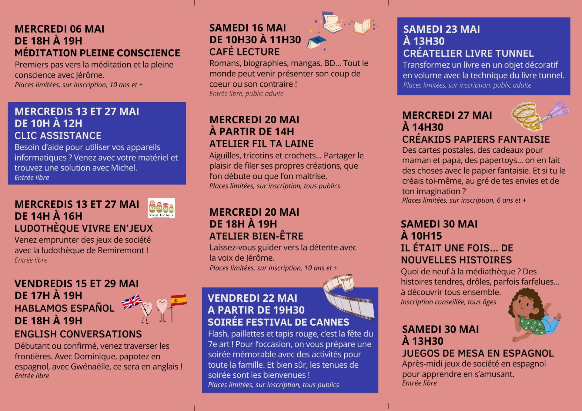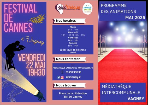 En temps fort, nous célébrons le 7e art le vendredi 22 mai à 19h30, lors d’une soirée consacrée au Festival de Cannes. Au programme, des animations pour toute la famille ! Sur inscription auprès de vos médiathécaires.