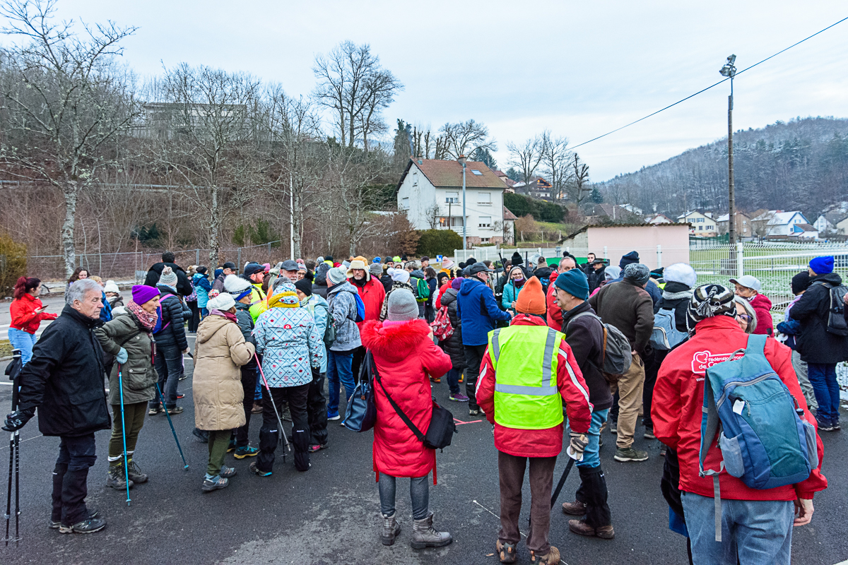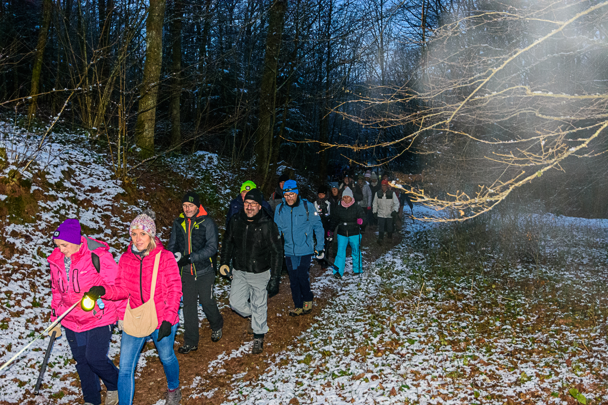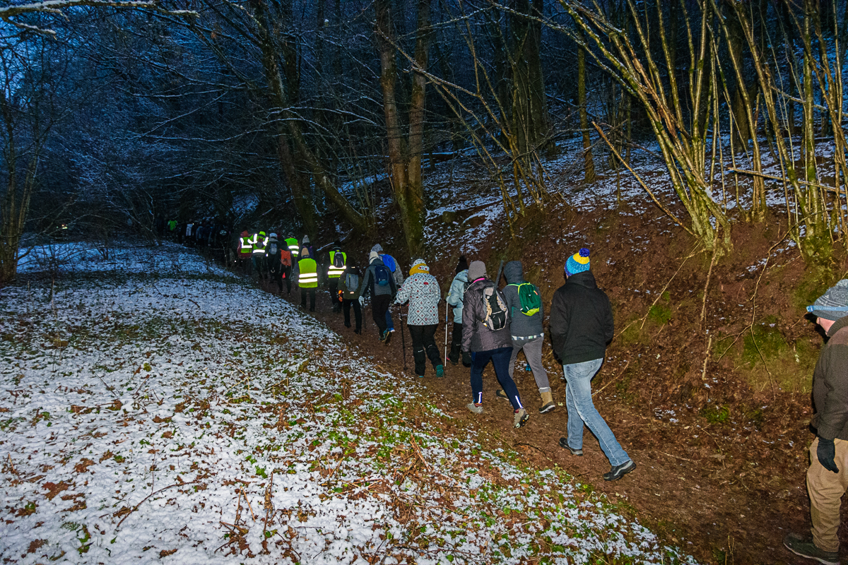 Au départ du parking du stade de rugby Pierre-Pebay, le rendez-vous était donné à la tombée de la nuit, à 16h30, pour une marche aux flambeaux de 9 kilomètres et 230m de dénivelé positif sur les sentiers forestiers.