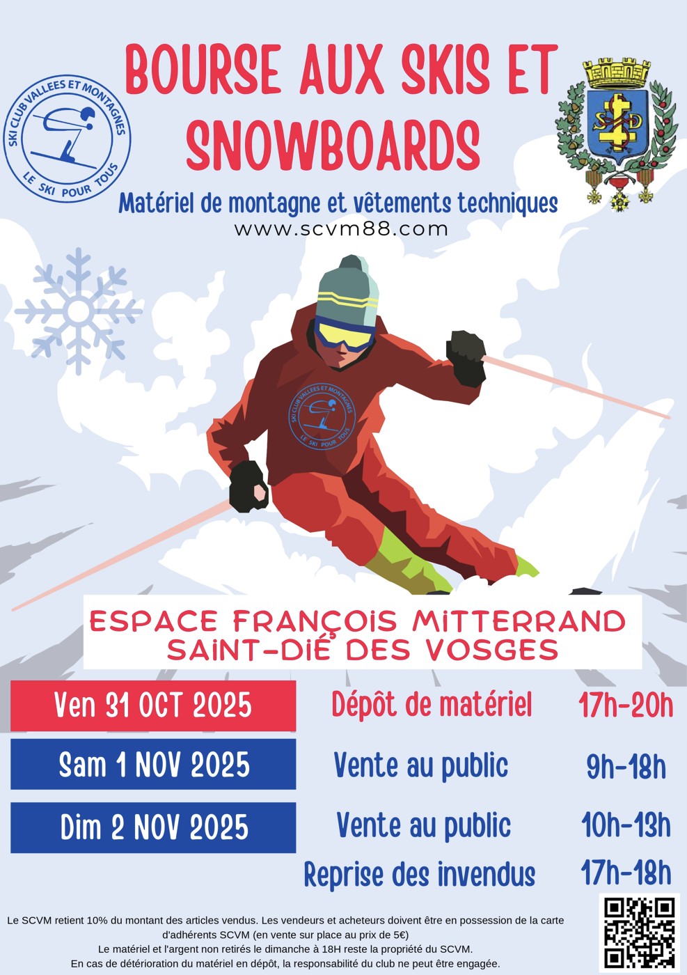 La traditionnelle bourse aux skis et snowboards du SCVM se tiendra du vendredi 31 octobre au dimanche 2 novembre prochain, toujours à l’Espace François-Mitterrand de Saint-Dié-des-Vosges.