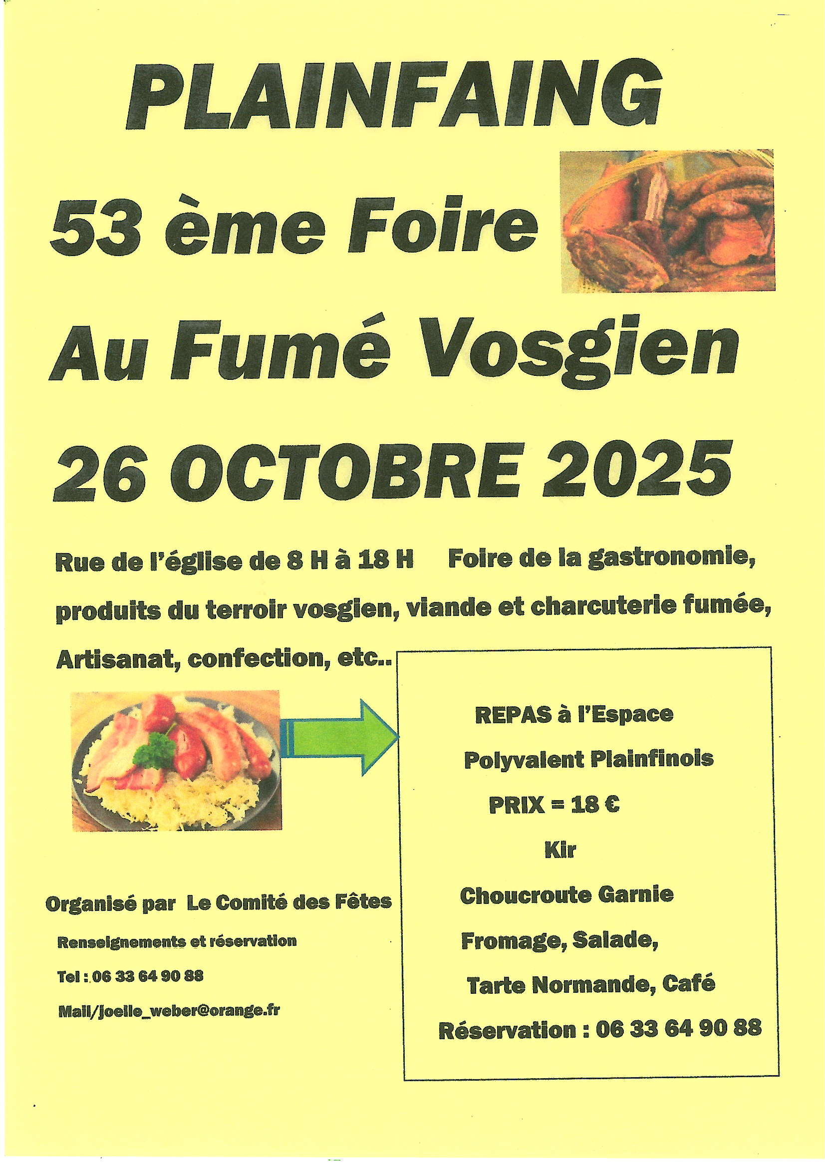 La Foire au Fumé Vosgien de Plainfaing fera sa 53e édition le dimanche 26 octobre prochain, de 8 h à 18 h, rue de l’Église. Organisée par le Comité des Fêtes, elle mettra en avant la gastronomie vosgienne, la viande et la charcuterie fumée, ainsi que l’artisanat et la confection locale.