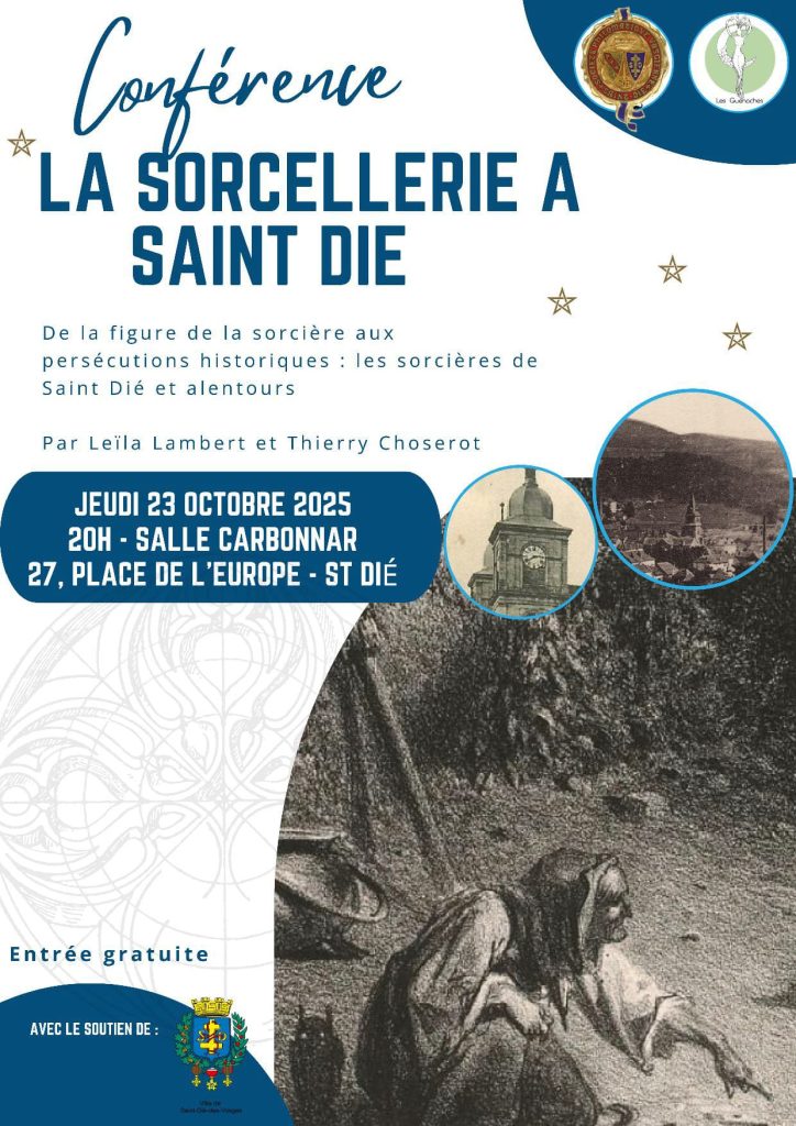 Une conférence intitulée « La sorcellerie à Saint-Dié » se tiendra jeudi 23 octobre à 20 h, à la salle Carbonnar de Saint-Dié-des-Vosges, avec le soutien de la Ville. Entrée libre.