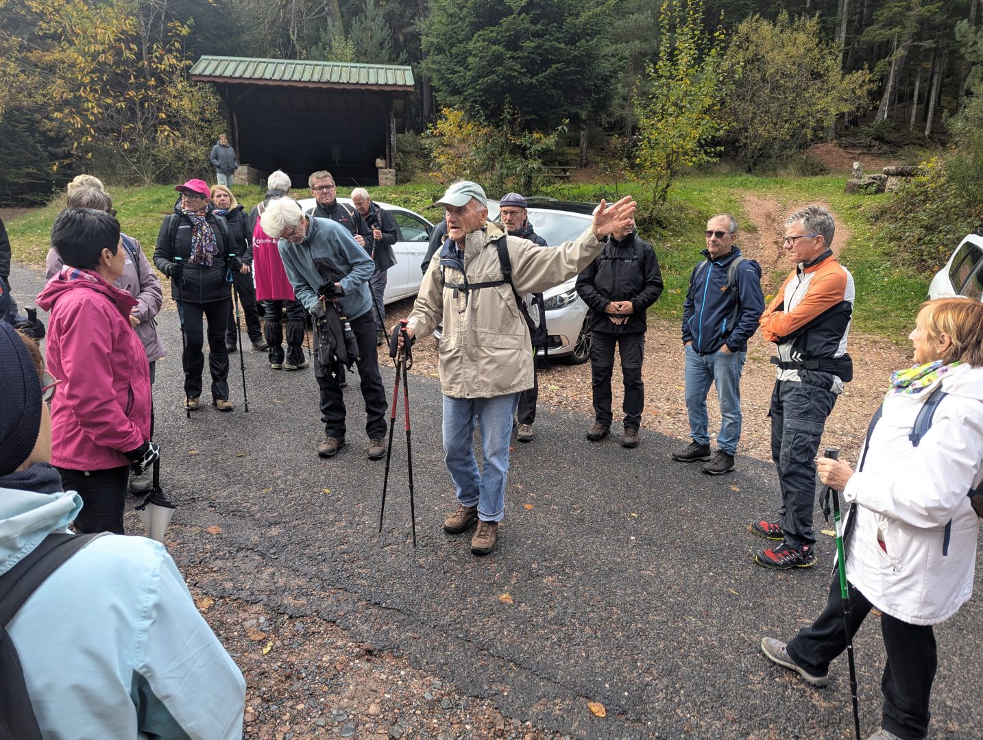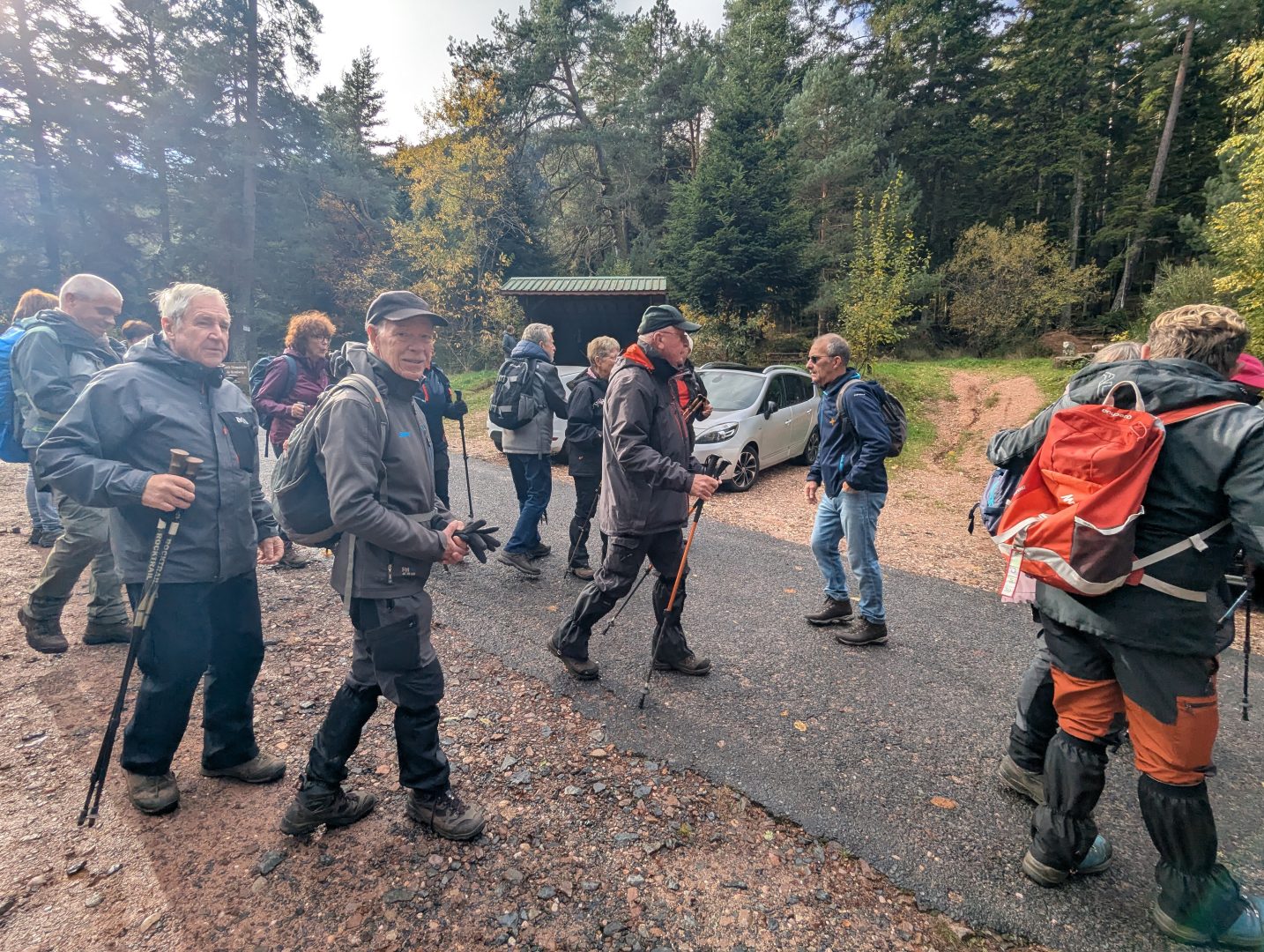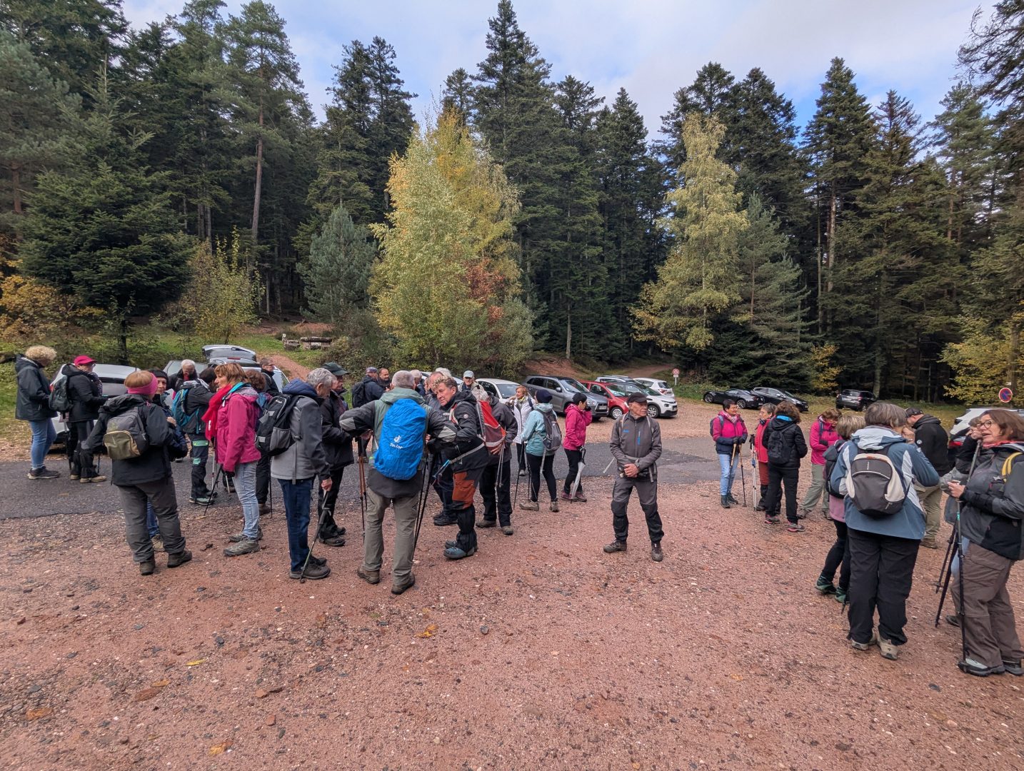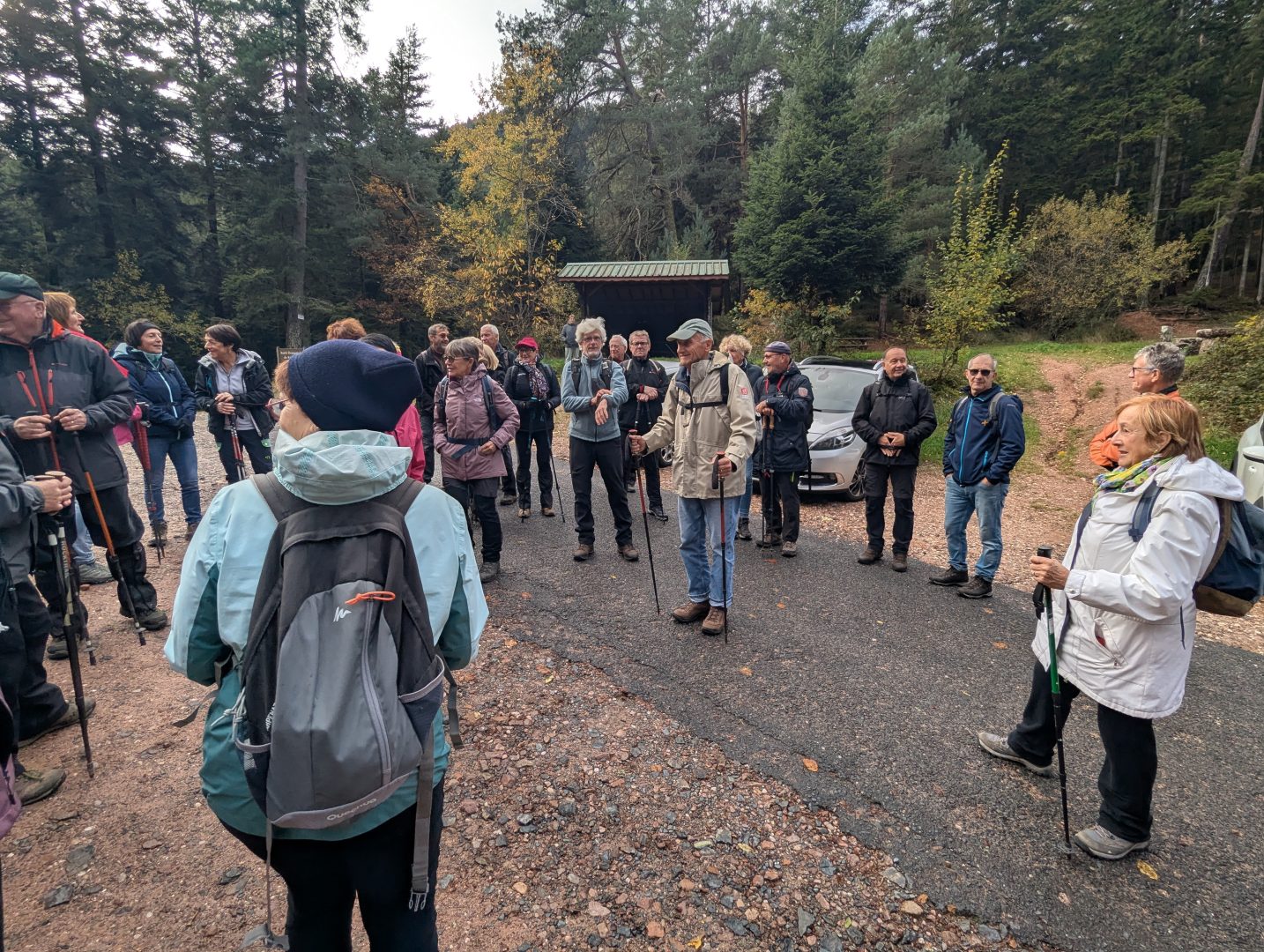 Au départ de l’aire des Trois Fauteuils, une cinquantaine de marcheuses et marcheurs, pour certains vêtus de rose, se sont élancés vers les roches Saint-Martin, du Kiosque et l’Enclume, guidés par Michel Barlier. Guide du Club Vosgien depuis une vingtaine d’années, c’est ce dernier qui avait concocté le parcours du jour, long d’environ 8 km pour 300 m de dénivelé positif.