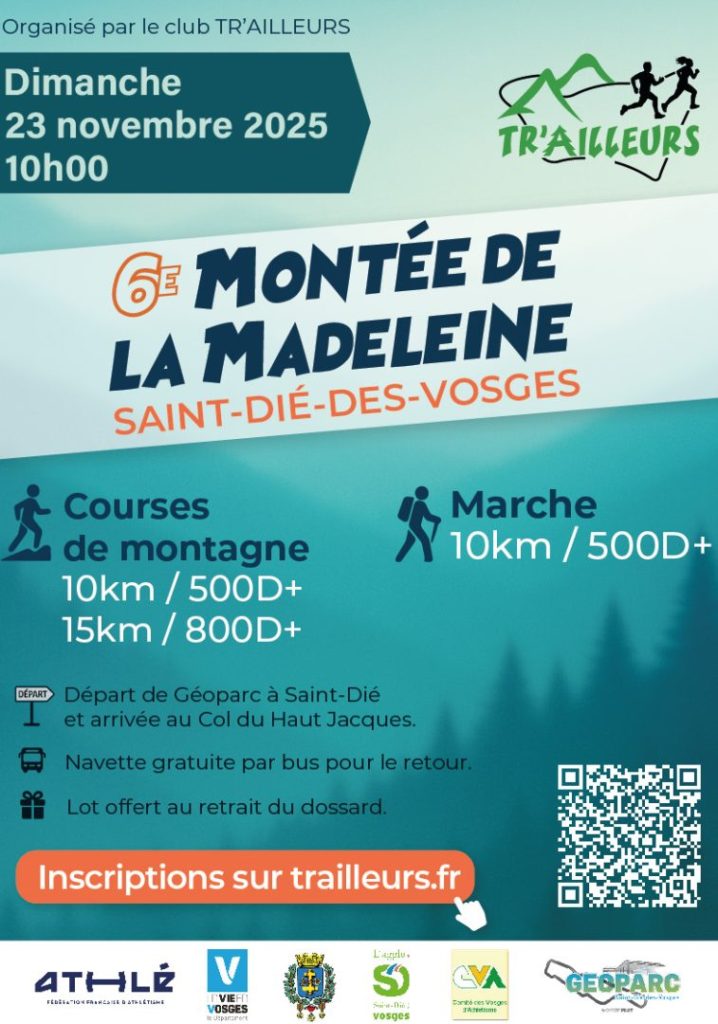 La 6e Montée de la Madeleine organisée par le club Tr’Ailleurs se tiendra le dimanche 23 novembre à Saint-Dié-des-Vosges. Le départ sera donné à 10 h au niveau de Géoparc, pour les courses de 10 km (500 D+) et 15 km (800 D+), Le départ de la marche sera donné 10 minutes plus tard.
