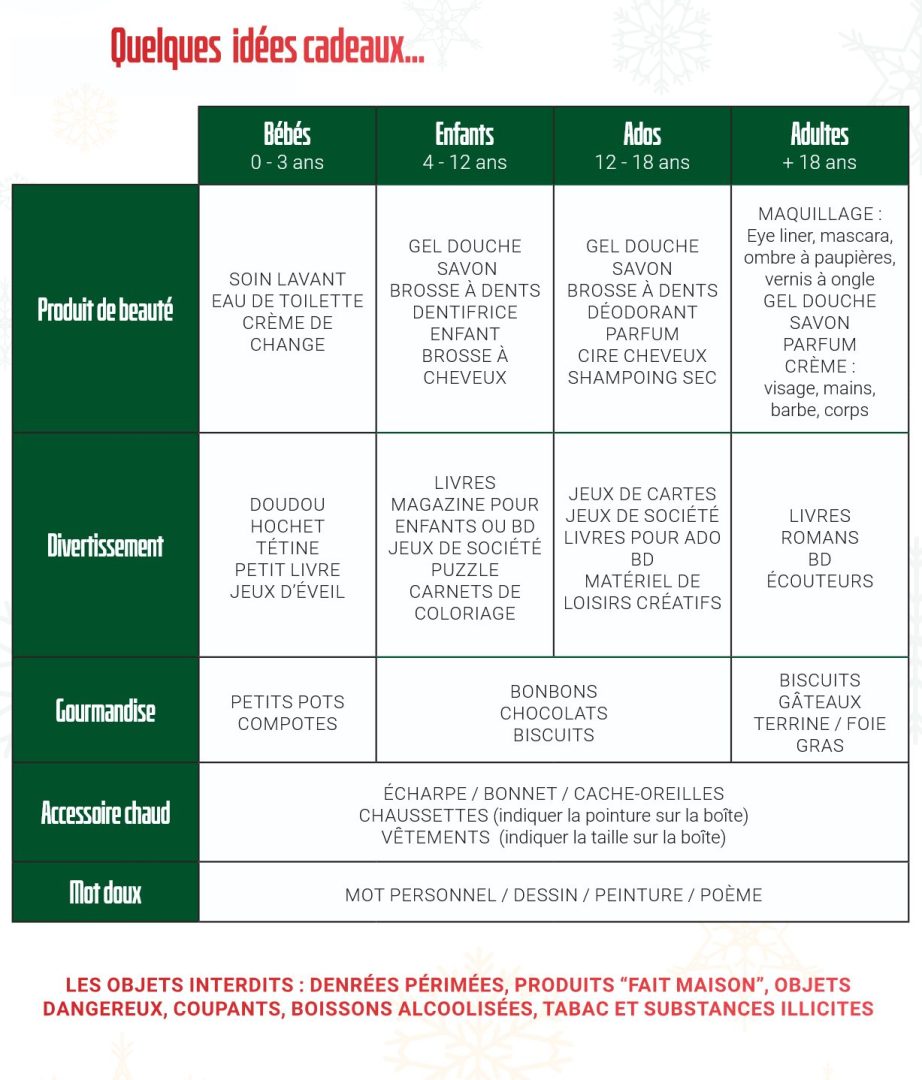 Les idées proposées par la Ville (à retrouver en fin d’article) permettent d’adapter le contenu aux bébés, enfants, ados ou adultes, avec des soins d’hygiène, livres, jeux, accessoires d’hiver ou douceurs selon les besoins. Les dons doivent respecter les règles indiquées, excluant notamment les denrées périmées ou les produits “fait maison”.