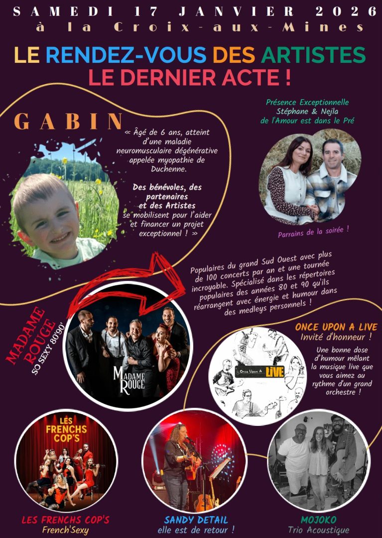 Le Rendez-vous des Artistes fera son ultime édition le samedi 17 janvier 2026 à La Croix-aux-Mines. Toujours organisée par For Life All United, cette soirée caritative sera cette fois-ci consacrée au jeune Gabin, atteint d’une myopathie de Duchenne. L’argent récolté ce soir-là permettra de contribuer à réaménager entièrement sa chambre et créer une salle de bain adaptée à l’évolution de sa maladie, afin d’anticiper l’usage de son futur fauteuil et de répondre à ses besoins quotidiens.
