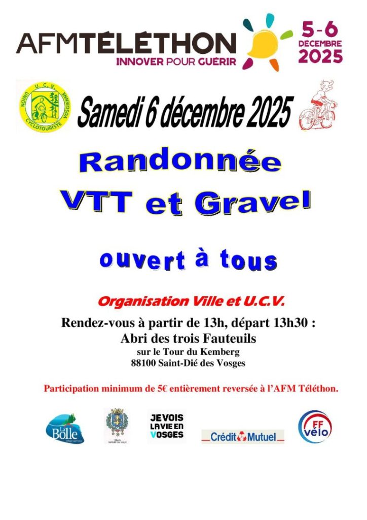 Dans le cadre du programme du Téléthon de la Ville de Saint-Dié-des-Vosges, l’UCV – Union Cyclotouriste Vosgienne – organise une randonnée VTT et Gravel le samedi 6 décembre. L’accueil se fera à 13 h à l’abri des Trois Fauteuils, dans le massif du Kemberg, avant un départ fixé à 13 h 30. Cette randonnée solidaire est ouverte à tous, avec une participation minimum de 5 €, somme qui sera intégralement reversée à l’AFM Téléthon.