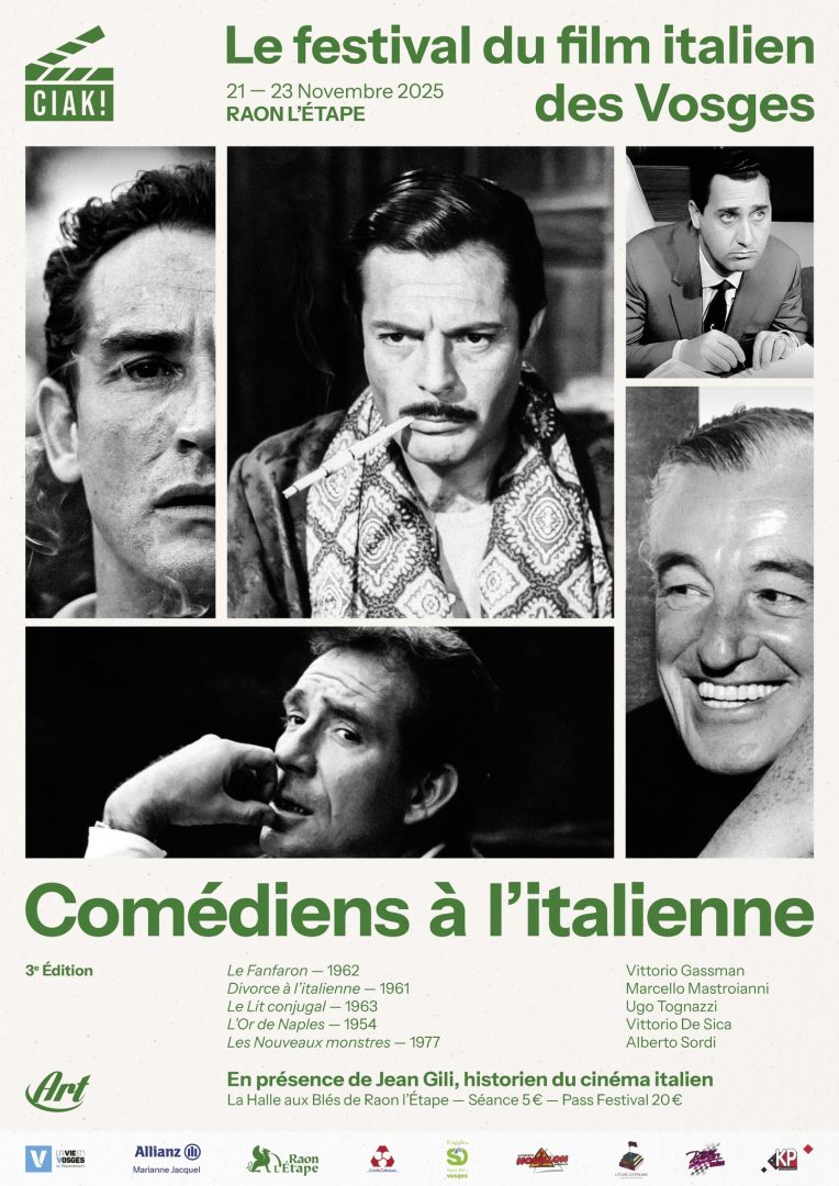 Ces vendredi 21, samedi 22 et dimanche 23 novembre, Raon-l’Étape accueillera la 3ᵉ édition du Festival du film italien de Raon-l’Étape, placée cette année sous le thème des comédiens à l’italienne. Les projections se tiendront à la Halle aux Blés, avec une sélection d’œuvres majeures du cinéma transalpin, de Le Fanfaron à Les Nouveaux monstres, en passant par Divorce à l’italienne, Le Lit conjugal et L’Or de Naples.