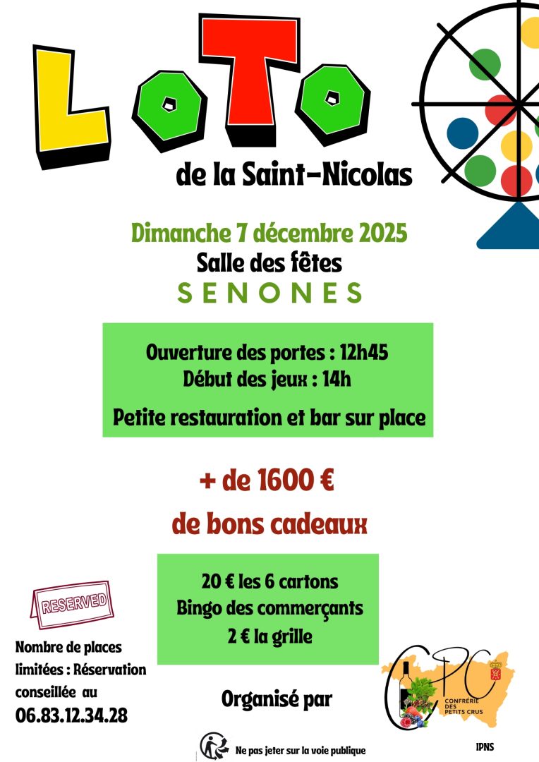 La Confrérie des Petits Crus des Vosges organise son loto de la Saint-Nicolas le dimanche 7 décembre, de 14 h à 18 h, à la salle des fêtes de Senones L’ouverture des portes est fixée à 12 h 45. Plus de 1600 € de bons cadeaux seront mis en jeu au cours de l’après-midi, avec petite restauration et buvette sur place.