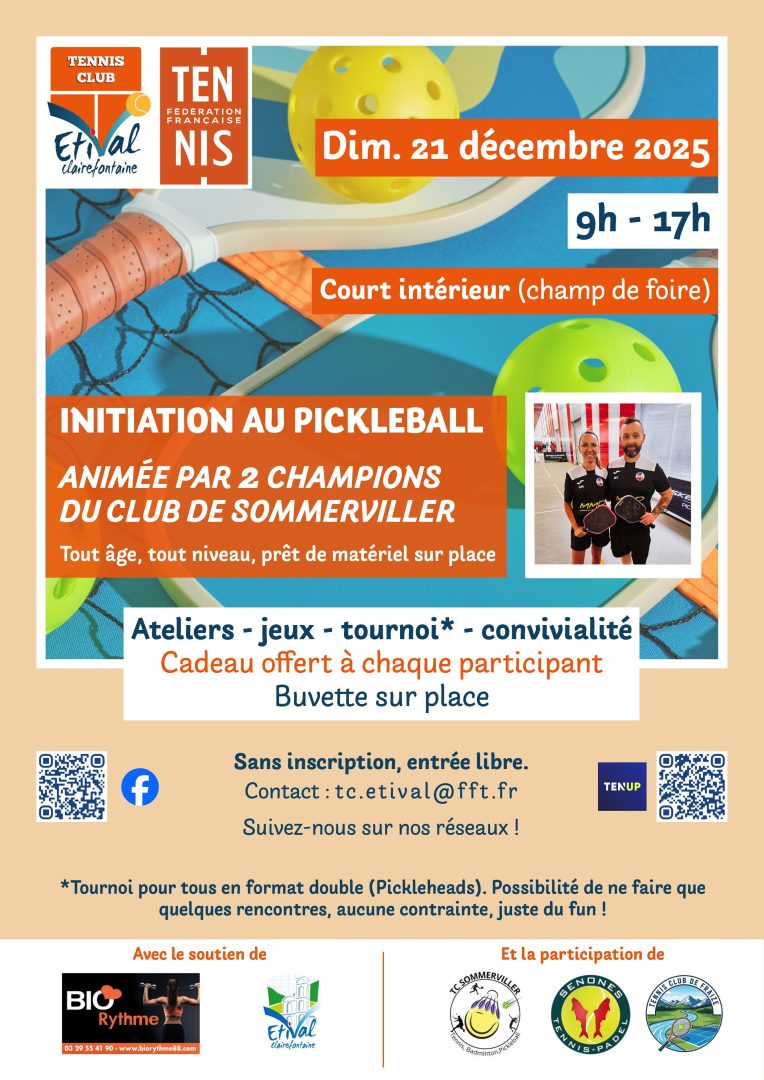 Le Tennis Club d’Étival-Clairefontaine propose une journée d’initiation au pickleball le dimanche 21 décembre, de 9 h à 17 h, sur le court intérieur du champ de foire. Cette découverte de la discipline sera animée par deux champions du club de Sommerviller. L’activité est ouverte à tous, quel que soit l’âge ou le niveau, avec prêt de matériel sur place.