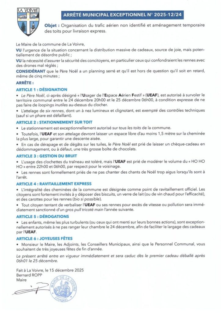 À La Voivre, un arrêté municipal aussi exceptionnel que humoristique encadre cette année le passage du Père Noël. Signé le 15 décembre par le maire Bernard Ropp, cet arrêté autorise l’« Usager de l’Espace Aérien Festif – UEAF – » à survoler la commune entre le 24 décembre à 20 h et le 25 décembre à 6 h, avec son attelage de rennes, en veillant à la sécurité et à la tranquillité des habitants.
