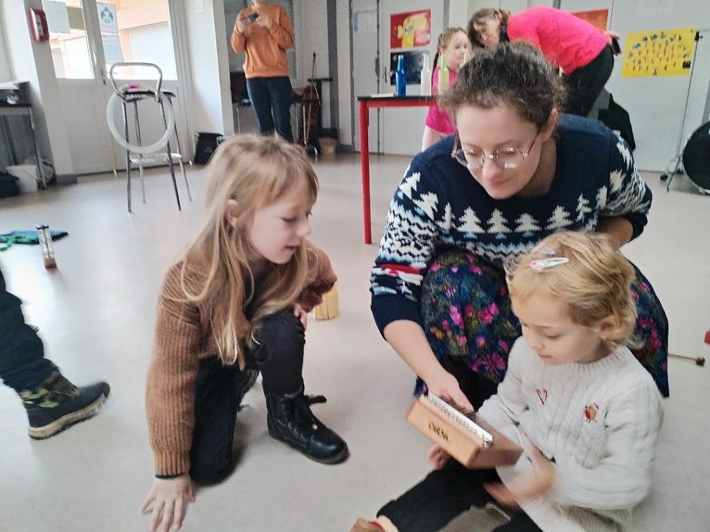 La découverte s’est poursuivie autour du travail du Conservatoire de Musique Olivier-Douchain, avec Élise Eschbach. À l’aide d’instruments comme des tambours à eau ou des bassines, les enfants ont expérimenté différents sons pour évoquer les bruits de la mer et la diversité du milieu aquatique.