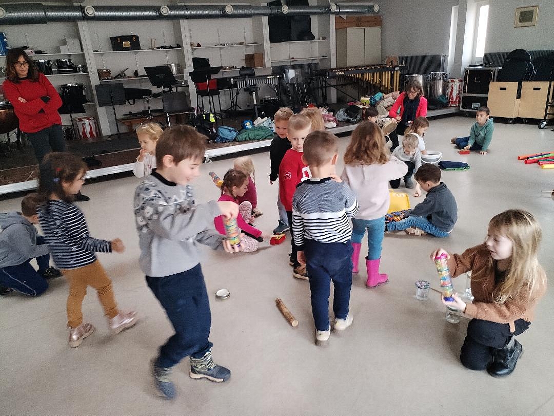 La découverte s’est poursuivie autour du travail du Conservatoire de Musique Olivier-Douchain, avec Élise Eschbach. À l’aide d’instruments comme des tambours à eau ou des bassines, les enfants ont expérimenté différents sons pour évoquer les bruits de la mer et la diversité du milieu aquatique.