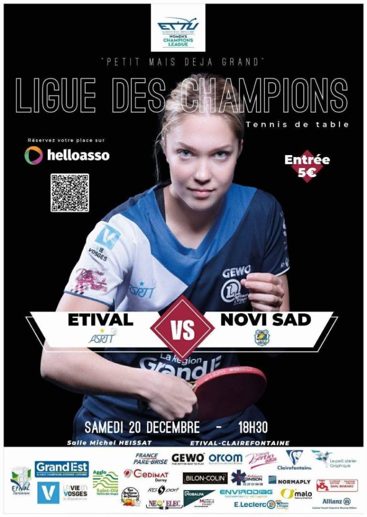 L’ASRTT Etival s’apprête à disputer une rencontre de Ligue des Champions de tennis de table, avec la réception du club serbe de Novi Sad. Ce match à domicile sera joué ce samedi 20 décembre, à partir de 18 h 30 à la salle Michel-Heissat. Les réservations se font sur helloasso et l’entrée est fixée à 5 €.