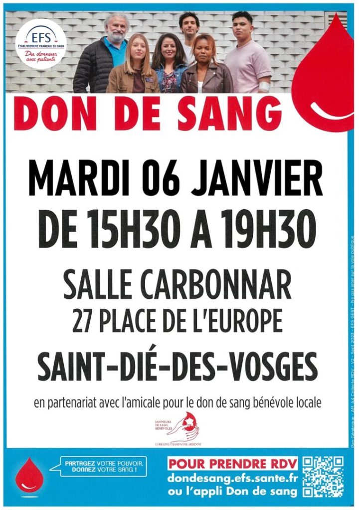 La prochaine collecte de sang organisée à Saint-Dié-des-Vosges par l’Établissement Français du Sang – EFS – Grand Est, avec le soutien de l’amicale locale des Donneurs de Sang bénévoles, aura lieu le mardi 2 décembre, de 15h30 à 19h30 à la salle Carbonnar (27, place de l’Europe).