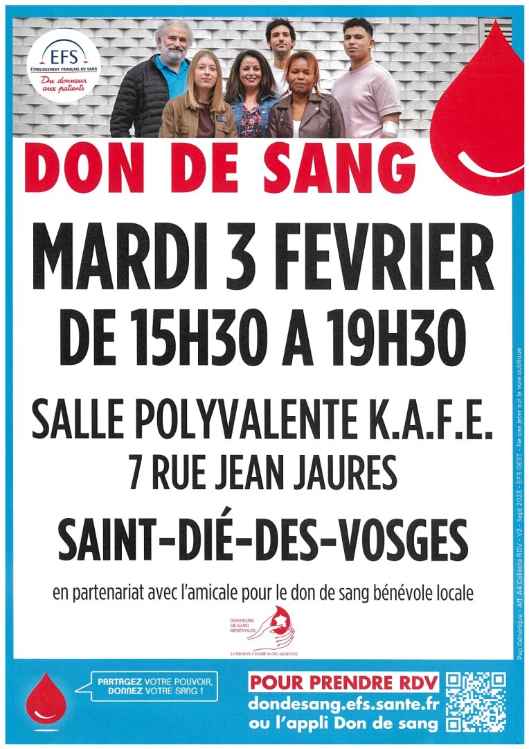 La prochaine collecte de sang organisée à Saint-Dié-des-Vosges par l’Établissement Français du Sang – EFS – Grand Est, avec le soutien de l’amicale locale des Donneurs de Sang bénévoles, aura lieu le mardi 3 février, de 15h30 à 19h30 à la salle polyvalente KAFE de Kellermann (7, rue Jean-Jaurès).