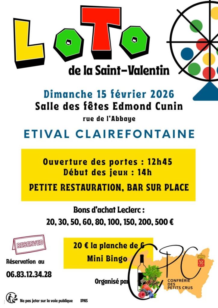 La Confrérie des Petits Crus – CPC – organise son loto de la Saint-Valentin, le dimanche 15 février à la salle des fêtes Edmond-Cunin d’Étival-Clairefontaine, L’ouverture des portes est prévue à 12h45, pour un début des jeux à 14h. Une petite restauration et un bar seront proposés sur place.
