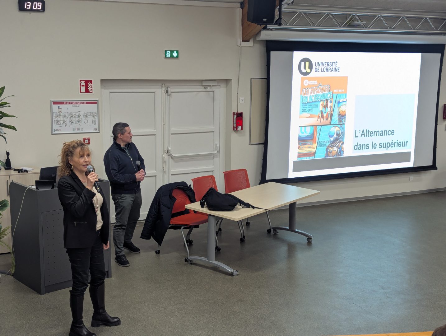 L’après-midi s’est ouvert par une présentation générale de l’alternance assurée par Annick Gorka et Francis Borghesi, respectivement coordinatrice alternance de l’Université de Lorraine et responsable pédagogique du CFA Université de Lorraine. Cette intervention en amphithéâtre donnait une vision globale des dispositifs et des avantages liés à l’alternance.