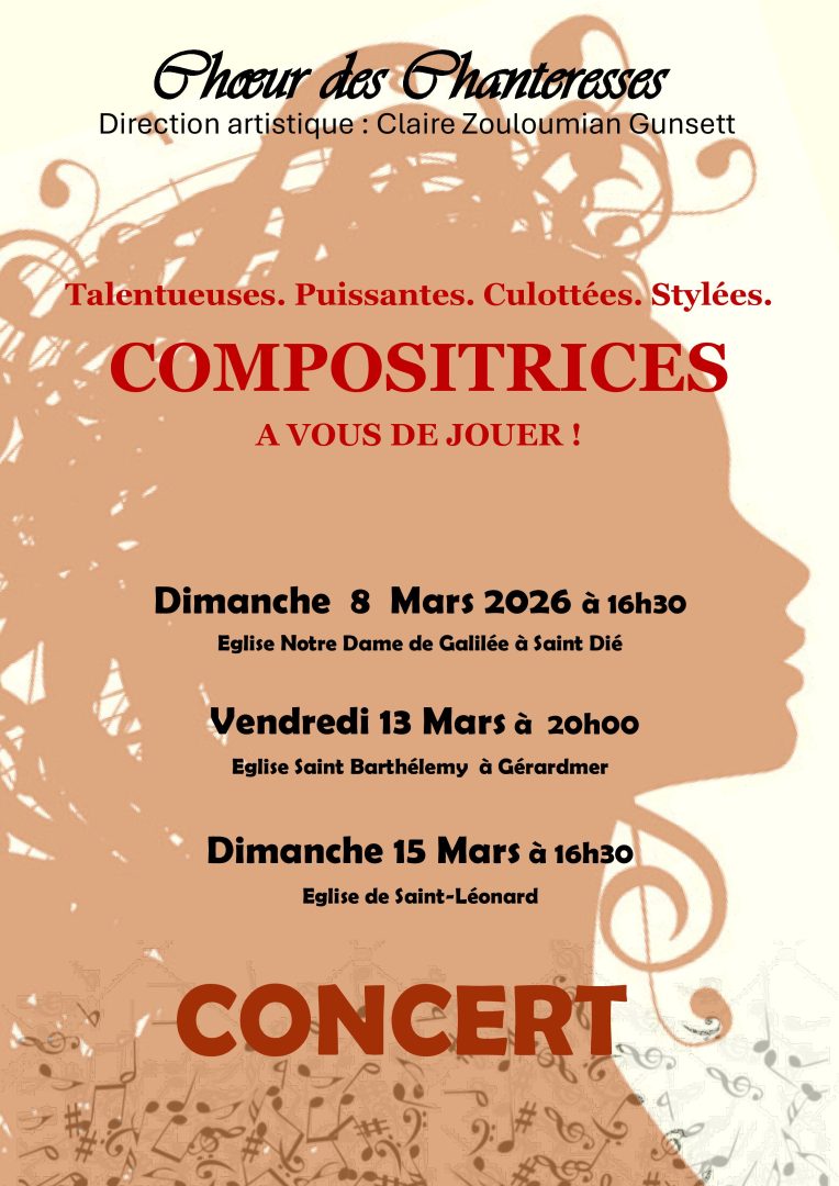 Le Chœur des Chanteresses présenteront prochainement un concert spécial intitulé « Compositrices » à l’occasion de la journée européenne de la femme, le dimanche 8 mars. Les œuvres polyphoniques seront chantées a capella et seront exclusivement signées de compositrices, de l’époque médiévale à nos jours. La direction artistique est assurée par Claire Zouloumian Gunsett.