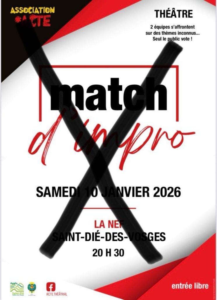 En raison des conditions météorologiques, la soirée match d’impro organisée par l’association ACTE, qui devait avoir lieu ce samedi soir à La Nef, est annulée.