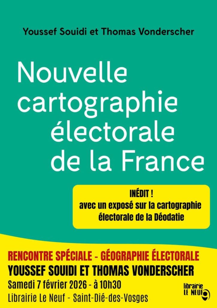 Samedi 7 février à 10h30, la Librairie Le Neuf accueillera Youssef Souidi et Thomas Vonderscher pour une rencontre spéciale consacrée à la géographie électorale, autour de leur ouvrage Nouvelle cartographie électorale de la France.