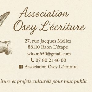 L’association Osey L’Écriture, basée à Gérardmer et créée par Mélodie Witz, propose désormais des ateliers d’écriture à Raon-l’Étape. Ces ateliers sont ouverts à tous, sans condition de niveau ni d’expérience. « Osez l’Écriture contribue à renforcer le lien social et l’accès à la culture sur le territoire. Nous souhaitons travailler en complémentarité avec les acteurs locaux pour proposer des actions adaptées aux différents publics. »